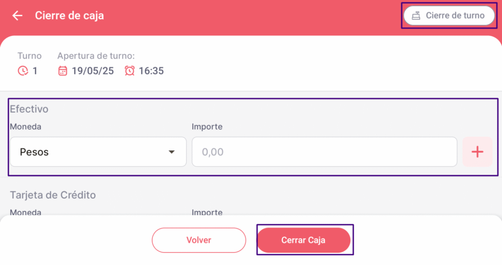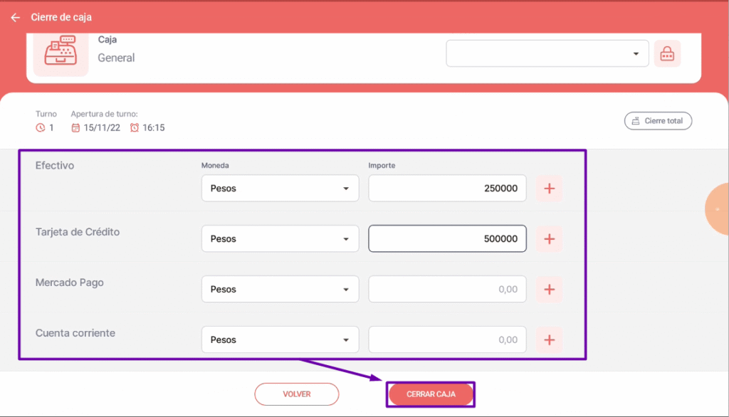 Procede a ingresar los medios de pago correspondientes con sus respectivos montos, y selecciona “Cerrar caja”.