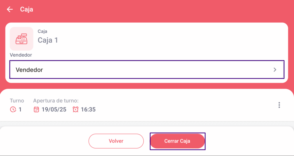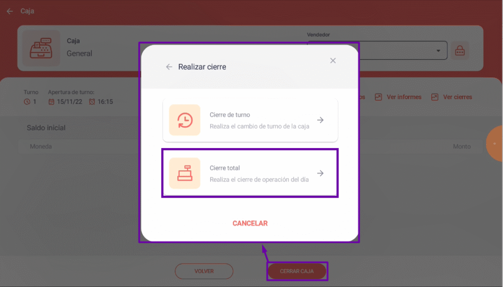 Una vez dentro del cierre, podrás seleccionar un vendedor, y decidir si el cierre será por turno o por cierre total.
