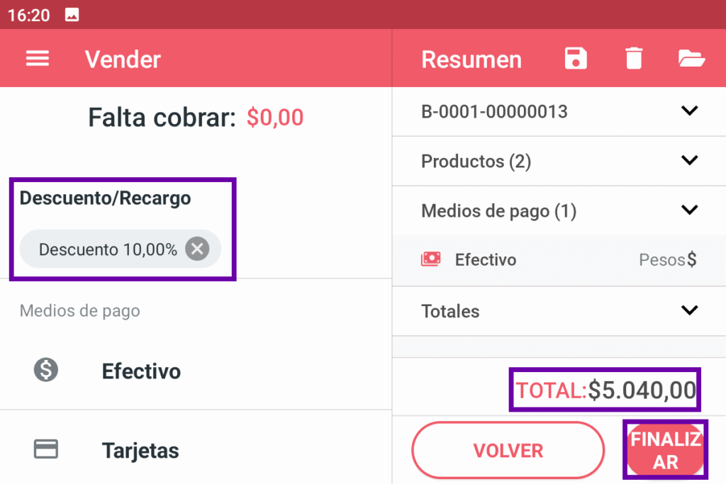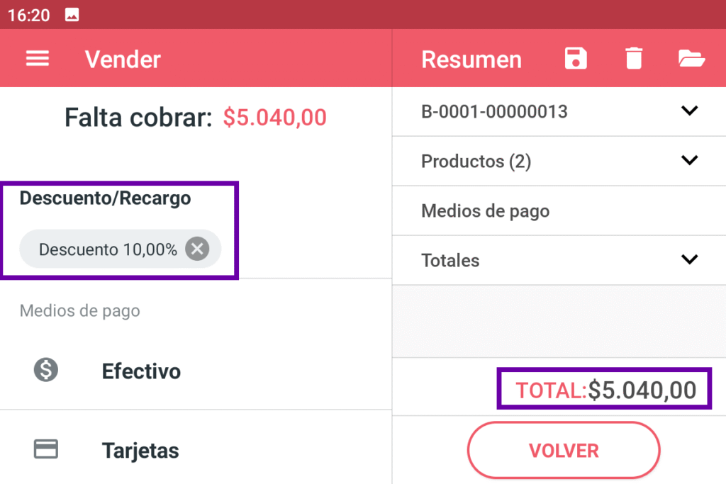 Una vez dentro, antes de aplicar los medios de pago, selecciona “Descuento/Recargo”: